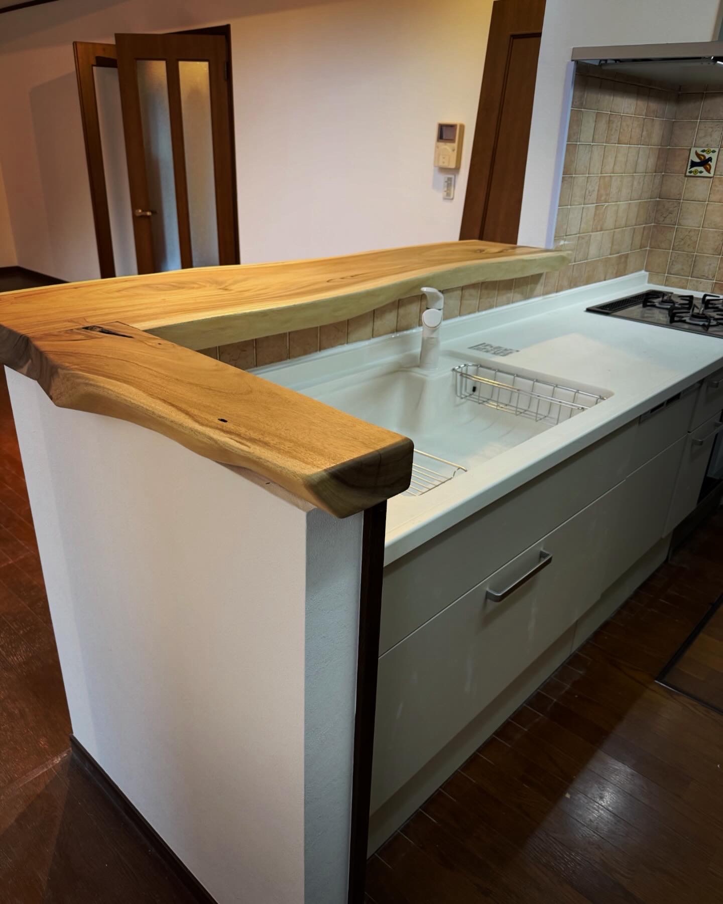 カウンターはモンキーボッドの無垢材に!